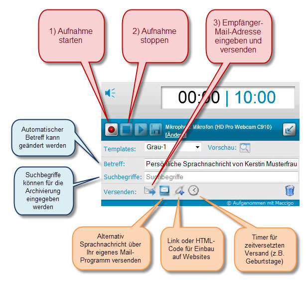 Die Empfänger sehen Ihr Bild und hören Ihre Stimme! Das schafft Sympathie und Vertrauen! Eine Maccigo-Audio-Mail ist wesentlich persönlicher als jede nomale Text-E-Mail! |