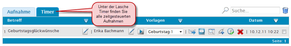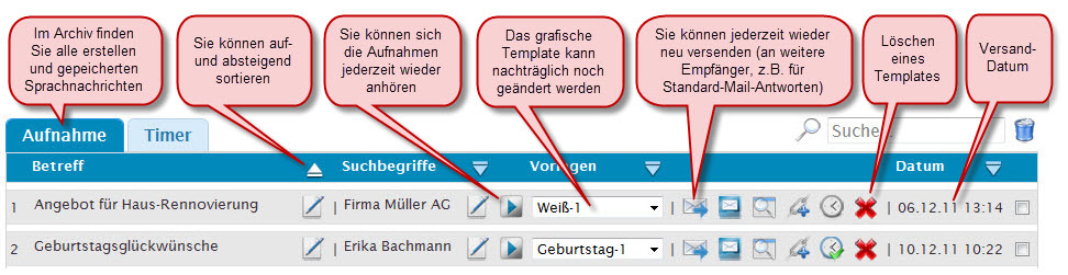 Im Archiv finden Sie übersichtlich die Liste Ihrer versandten Sprachnachrichten:
